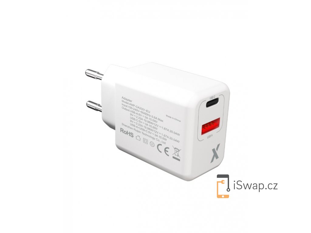Nabíječka pro iPhone, iPad a mnoho dalších zařízení s kabelem do USB-A a USB-C portu. Nabijecí adaptér disponuje jak starším USB-A portem, tak novějším USB-C. Podpora rychlého nabíjení až 20W. CE certifikace.